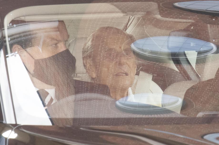 epa09077626 Britain's Prince Philip (2-R) leaves the King Edward VII hospital in London, Britain, 16 March 2021. Prince Philip had bee?n admitted to hospital as a precautionary measure after feeling unwell. EPA-EFE/FACUNDO ARRIZABALAGA