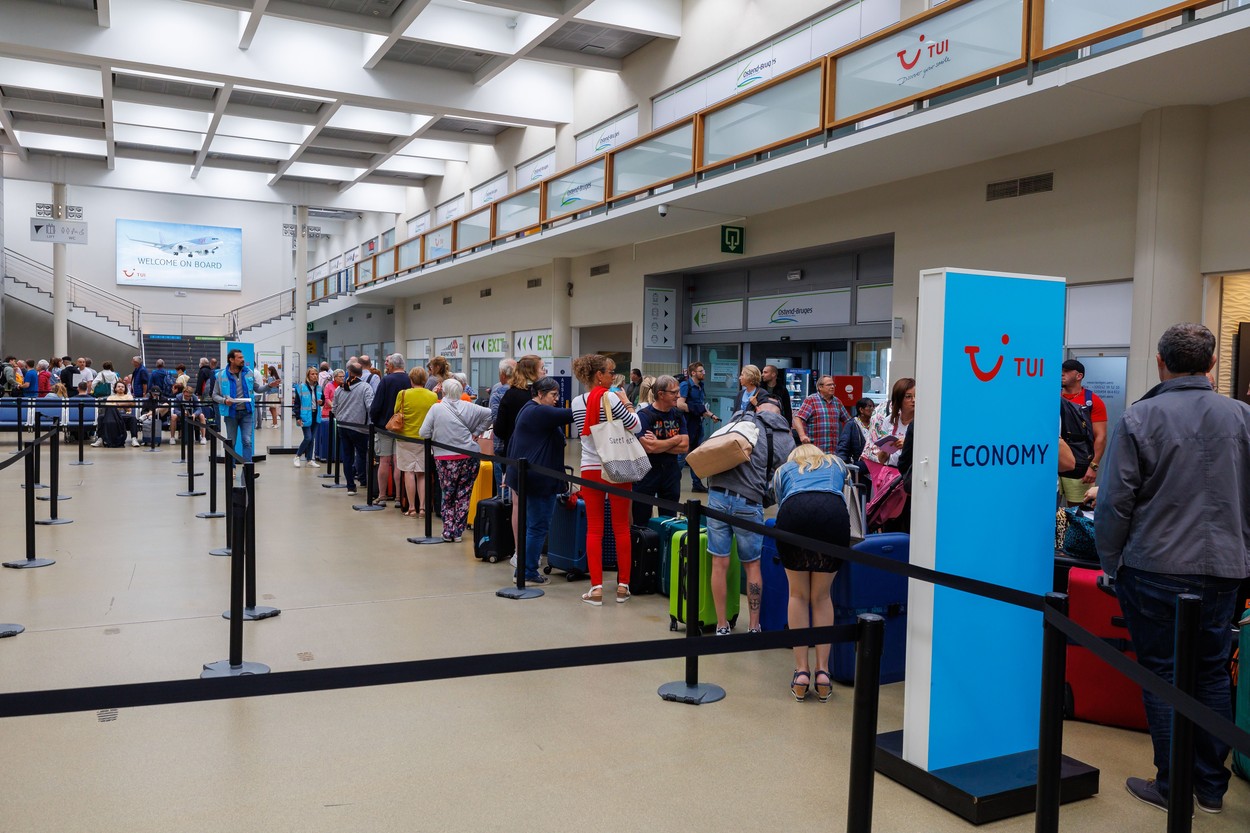 Illustration picture shows people waiting for a flight at the Oostende Airport, Monday 20 June 2022, in Oostende. Travellers come to the Oostende Airport after the Brussels airport operator has cancelled all outgoing flights from Brussels due to a national action day of the trade unions, defending purchasing power and demanding an amendment to the 1996 wage standards law that regulates wage developments in Belgium. Trade Unions National Action Day Oostende Airport, Oostende, Belgium - 20 Jun 2022,Image: 701288916, License: Rights-managed, Restrictions: , Model Release: no, Credit line: Profimedia