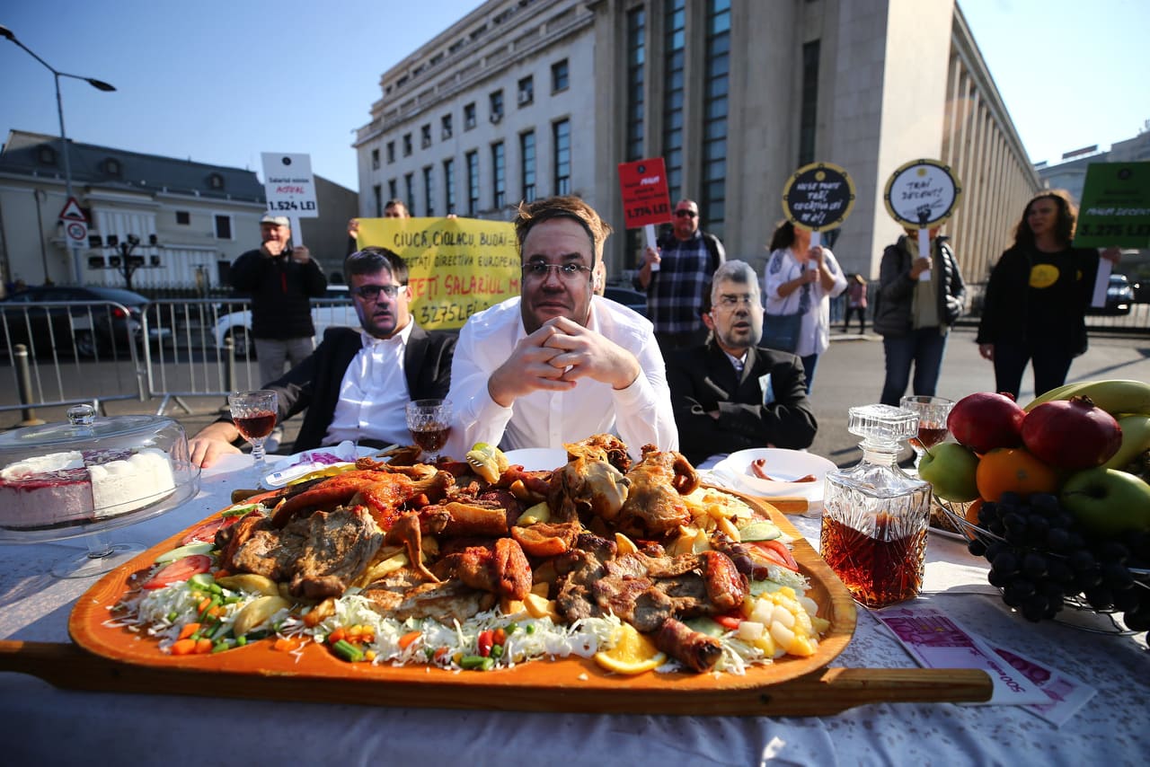 Protest în timpul ședinței de Guvern pe tema salariului minim european. „Ciucă”, „Ciolacu” și „Budăi” au luat masa în Piața Victoriei