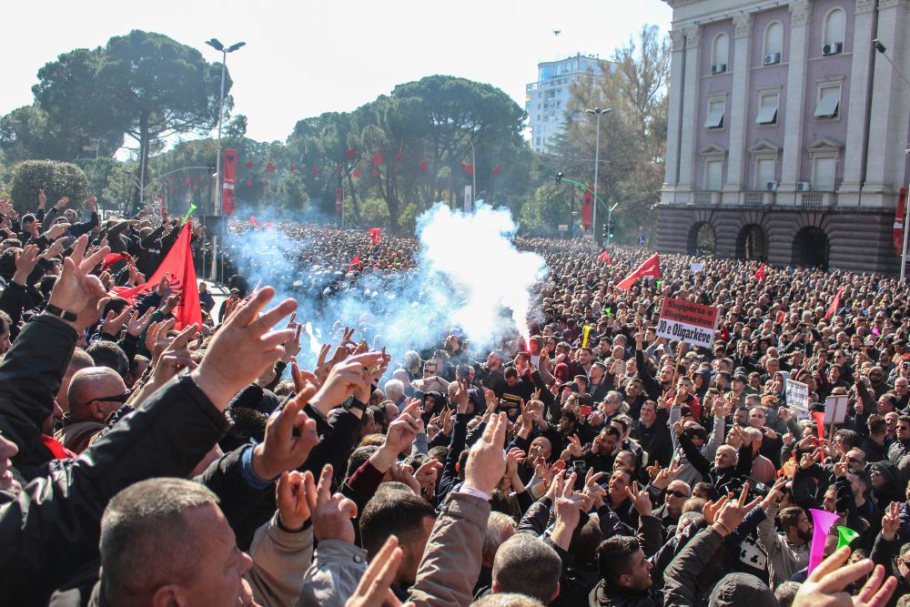 epa07374394 Supporters of Albanian opposition shout anti Government slogans during a protest in front of government building in Tirana, Albania, 16 February 2019. Reports state that they are demanding the resignation of the Albanian Prime Minister Edi Rama accusing him of alleged corruption and vote buying. EPA-EFE/MALTON DIBRA