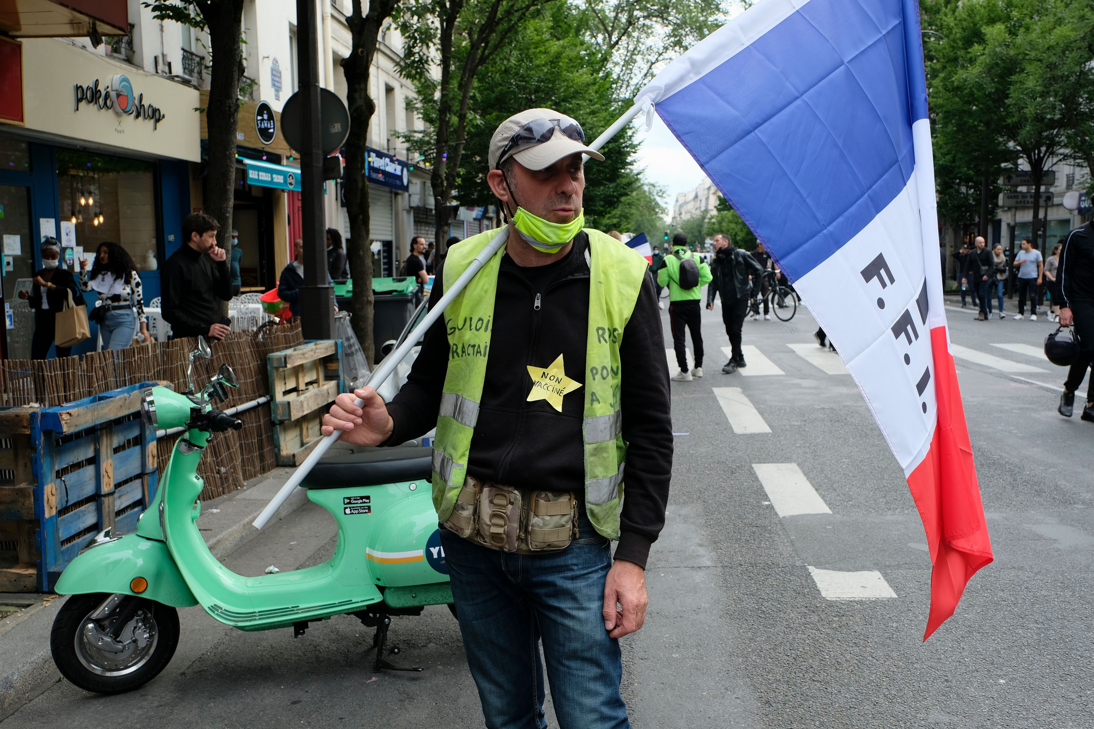 A man wearing a star of David protests against compulsory vaccinations in Paris Protest against compulsory covid vaccination, Paris, France - 14 Jul 2021,Image: 621519551, License: Rights-managed, Restrictions: , Model Release: no, Credit line: Profimedia