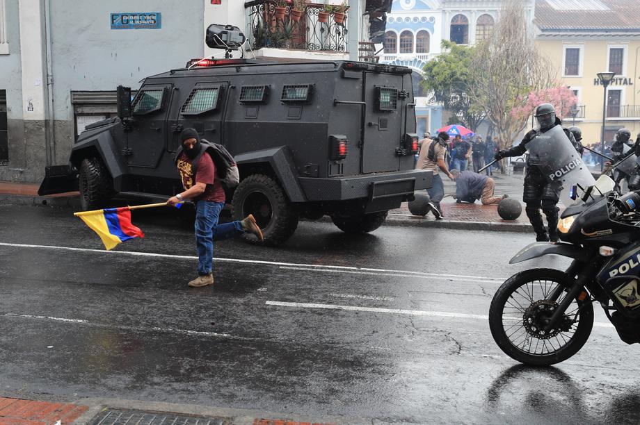epa07893273 Demonstrators clash with police agents during a day of protest against the economic measures adopted by the Ecuadorian Government led by President Lenin Moreno, in Quito, Ecuador, 03 October 2019. Moreno announced the elimination of gasoline subsidies, labor reforms, tax changes and other economic measures in order to meet conditions imposed by the International Monetary Fund (IMF). EPA-EFE/Jose Jacome