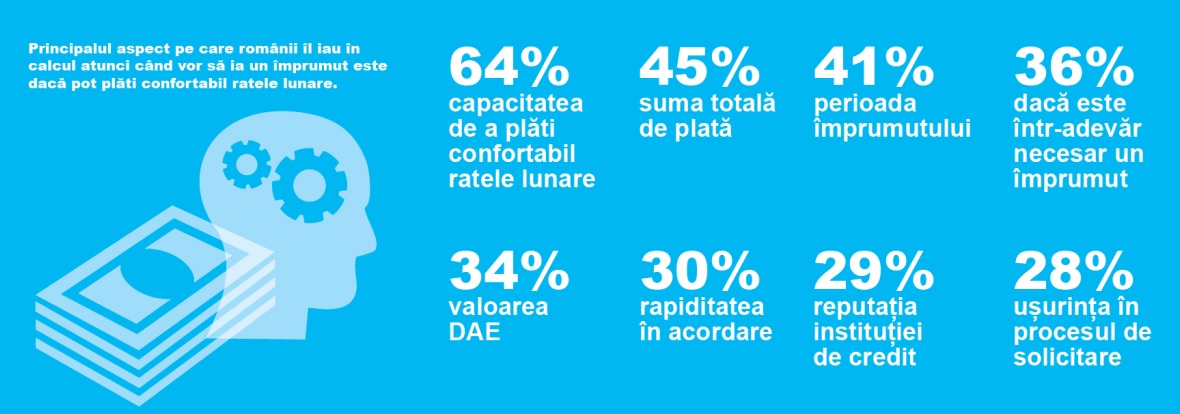 Totodată, aproape 7 din 10 respondenți declară că au capacitatea de a plăti confortabil ratele lunare, acesta fiind principalul aspect pe care clienții îl iau în calcul atunci când vor să ia un împrumut (64%), alături de suma totală de rambursat (45%) și de perioada împrumutului (41%).