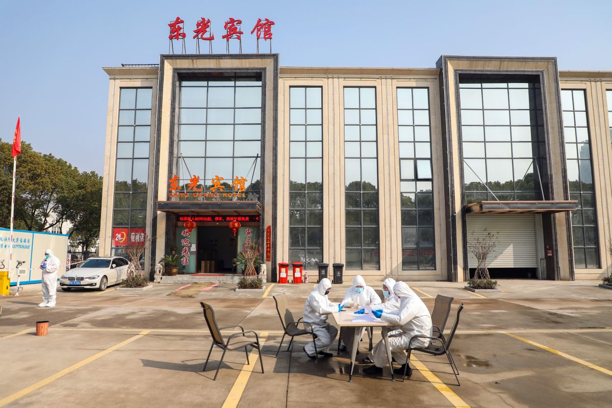 Câțiva oameni în costume de protecție discută la o masă în fața unui spital din Wuhan, China FOTO: EPA