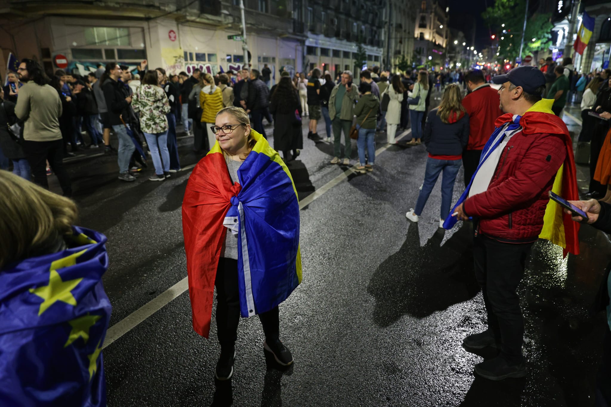 Susținătorii lui Nicușor Dan flutură steaguri ale României și Uniunii Europene. Foto: Vlad Chirea/Libertatea