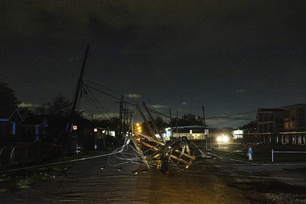 epa10366667 Downed lines and utility poles block roads surrounding West Jefferson High School after a tornado traveled along the Mississippi River in Harvey, south of New Orleans, Louisiana, USA, 14 December 2022. A large weather system has caused damage across the US for two days with winter weather in the North and rain and storms in the South. EPA-EFE/CHRISTIANA BOTIC