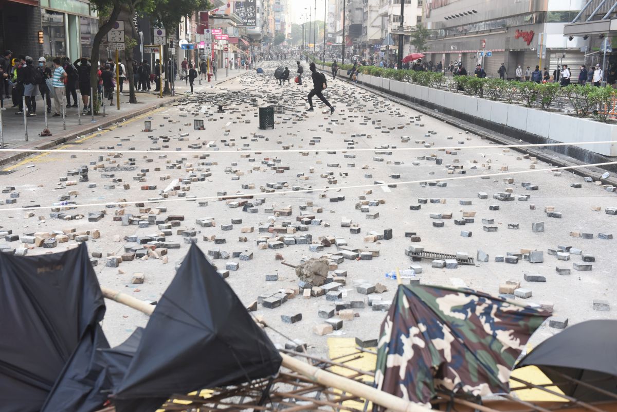 Câmp de luptă în Hong Kong. Pietre și bâte lăsate în urmă după confruntările dintre protestatari și polițiști FOTO: EPA