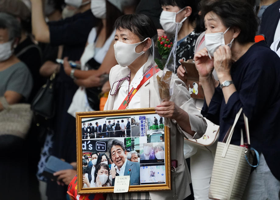 epa10066141 A woman holds a collage as she waits to bid farewell before the vehicle carrying the body of former Prime Minister Shinzo Abe leaves Zojoji Temple at the end of the funeral procession in Tokyo, Japan, 12 July 2022. Abe was shot dead on 08 July by a 41-year-old former member of the Japan Maritime Self-Defense Force, in Nara, western Japan, during an Upper House election campaign to support a candidate of his ruling party. EPA-EFE/CHRISTOPHER JUE
