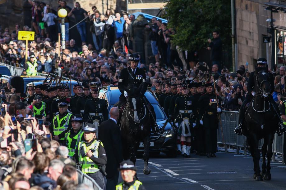 epa10179900 Britain's Princess Anne, the Princess royal (L), and Prince Andrew, Duke of York (C) join the procession to take the body of Britain's late Queen Elizabeth II from the Palace of Holyroodhouse to St Giles Cathedral, where the queen will lie at rest, in Edinburgh, Scotland, Britain, 12 September 2022. Members of the public will be able to pay their respects for 24 hours before the coffin is taken to London for a period of lying in state prior to her funeral. EPA-EFE/ADAM VAUGHAN