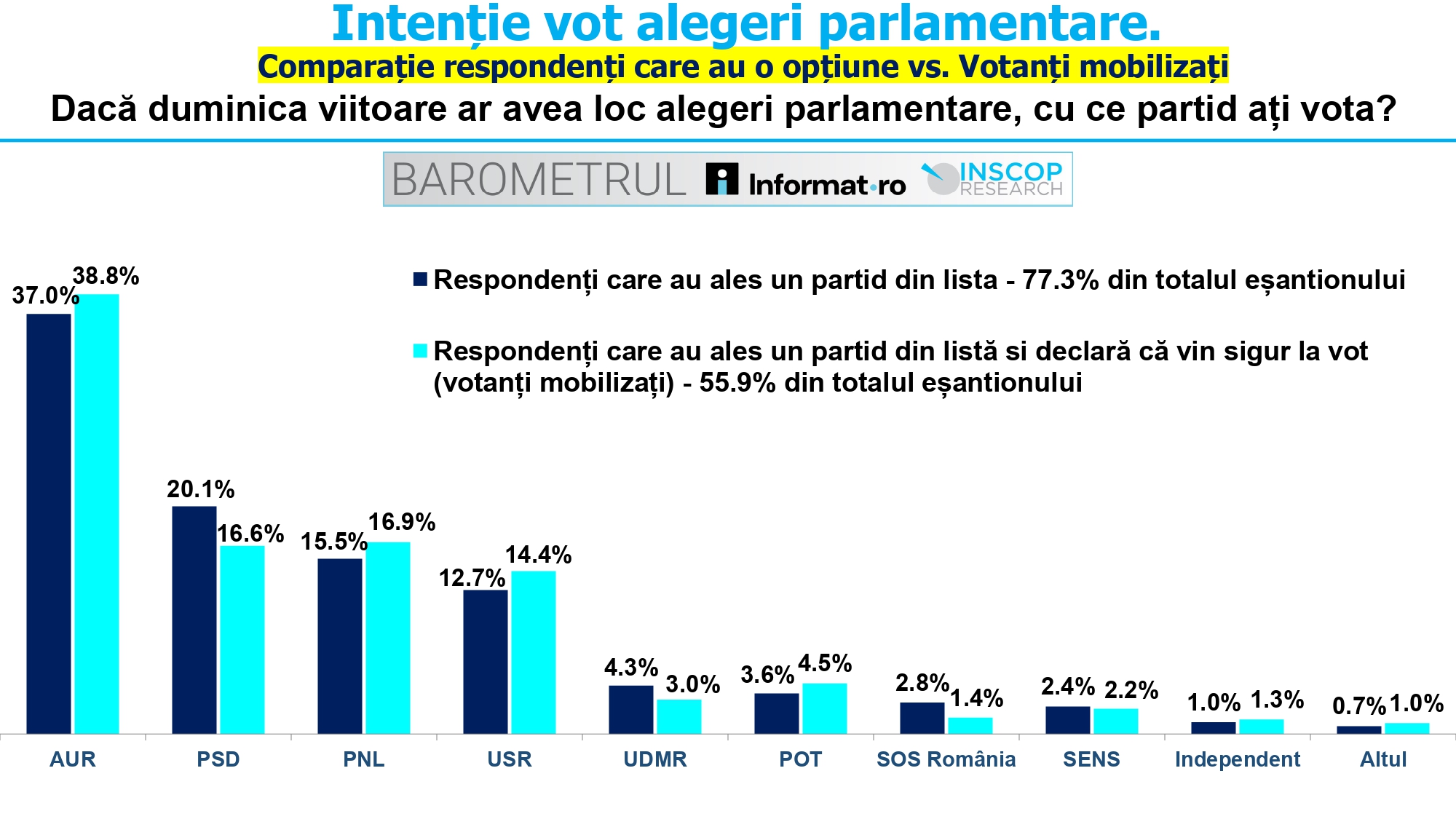 Dintre cei care au declarat că sunt siguri că vor merge la vot (55,9% din eșantion), preferințele se schimbă ușor: AUR obține 38,8%, PNL 16,9%, iar PSD 16,6%. USR înregistrează 14,4%, în timp ce UDMR are 3%, POT 4,5%, SOS România 1,4%, iar SENS 2,2%. De asemenea, 1,3% ar susține un candidat independent, iar 1% ar vota pentru alte partide.