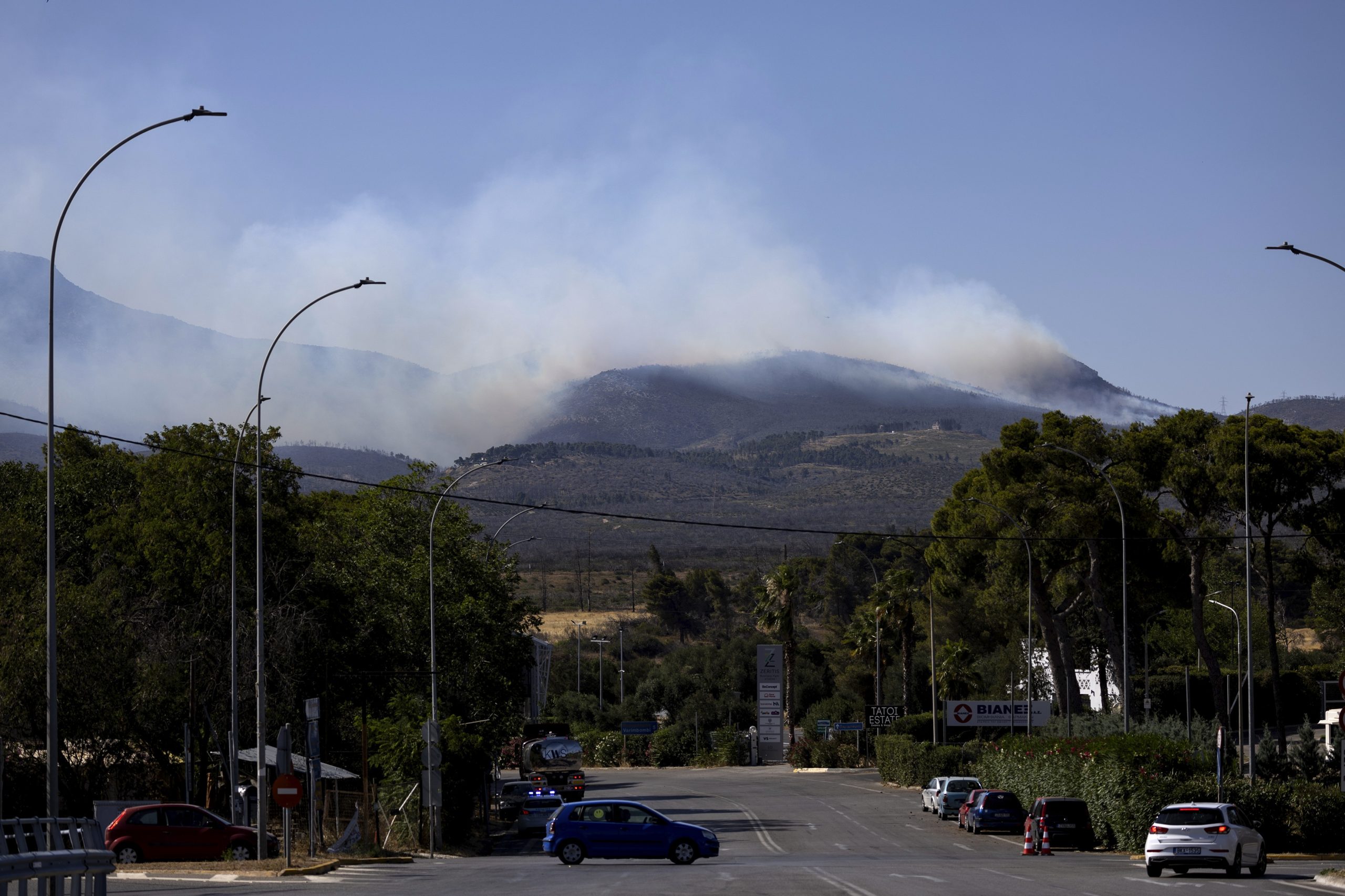 Smoke rises from a wildfire near Katsimidi area, on mount Parnitha northwest of Athens, Saturday, June 29, 2024.,Image: 885760045, License: Rights-managed, Restrictions: This content is intended for editorial use only. For other uses, additional clearances may be required., Model Release: no