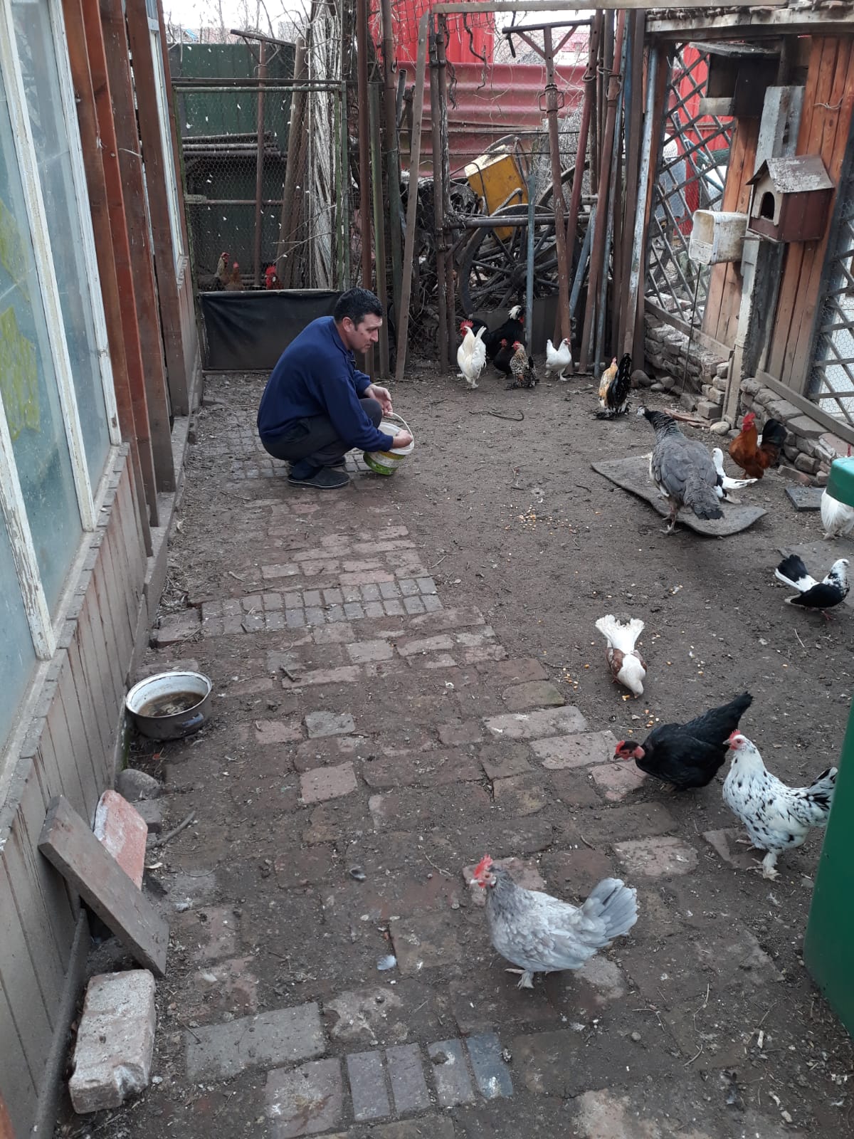 Aurel Olteanu, printre găinile pe cae le hrănește inainte de intra în tură