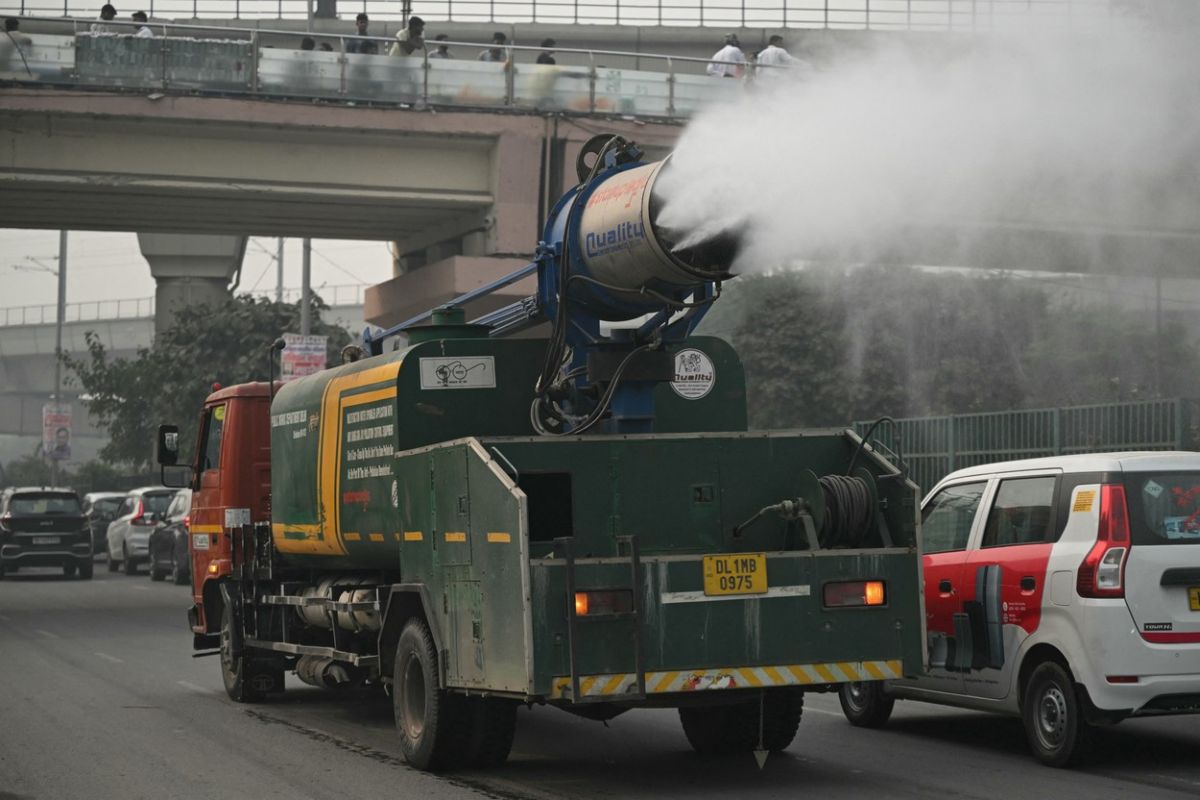 An Anti Smog gun seen sprinkling water over the streets to settle down dust particles amid rise in Pollution Levels at near Hazrat Nizamuddin, on October 29, 2023 in New Delhi, India. Dense Smog Amid Rising Air Pollution Levels In Delhi-NCR, New DElhi, India - 29 Oct 2023,Image: 817993176, License: Rights-managed, Restrictions: , Model Release: no