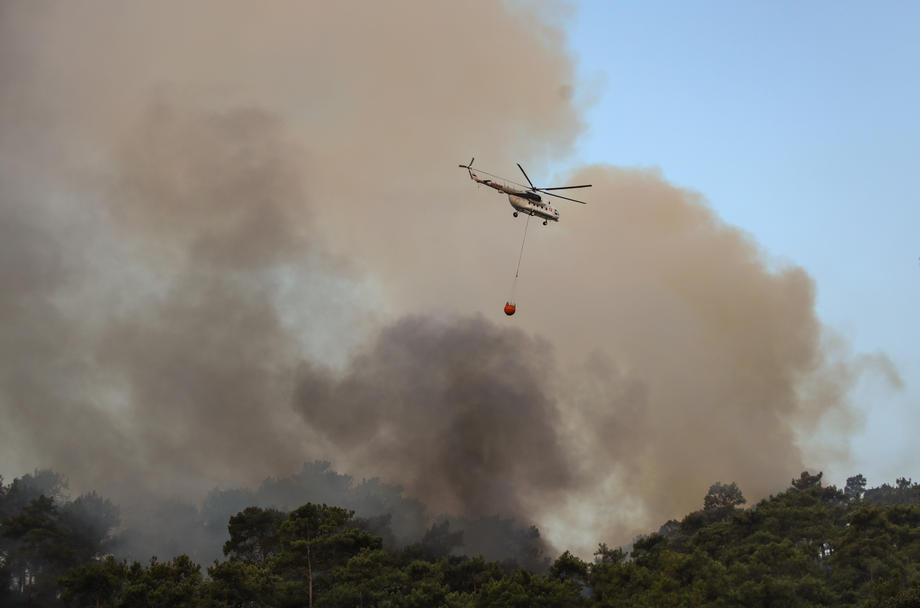 epa09382390 A helicopter carries water to put out a wildfire burning at a rural area of Marmaris district of Mugla, Turkey, 31 July 2021. According to a statement by the Turkish government's Disaster and Emergency Management Presidency (AFAD) released on 30 July 2021, at least three people lost their lives and some 271 others were affected by blazes that swept through the country's southern coast. EPA-EFE/ERDEM SAHIN