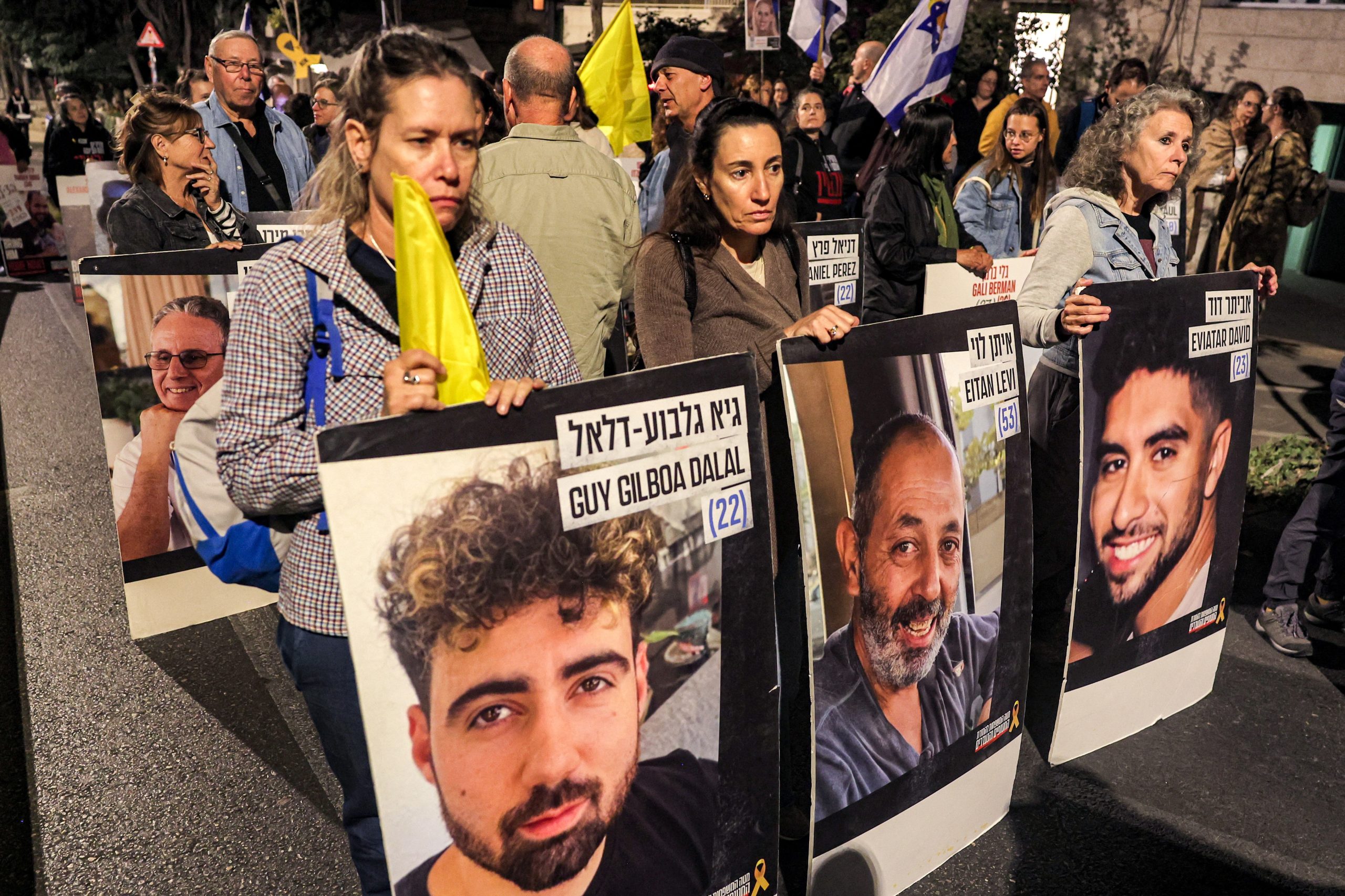 Protesters stand with portraits of Israeli hostages Guy Gilboa Dalal (22), Eitan Levi (53), Eviatar David (23), and others during a demonstration by the families of the hostages taken captive in the Gaza Strip by Palestinian militants during the October 7, 2023 attacks, calling for action to release the hostages, outside the Israeli Prime Minister's residence in Azza (Gaza) Street in central Jerusalem on October 24, 2024 amid Israel's ongoing war with Hamas.,Image: 925889347, License: Rights-managed, Restrictions: , Model Release: no