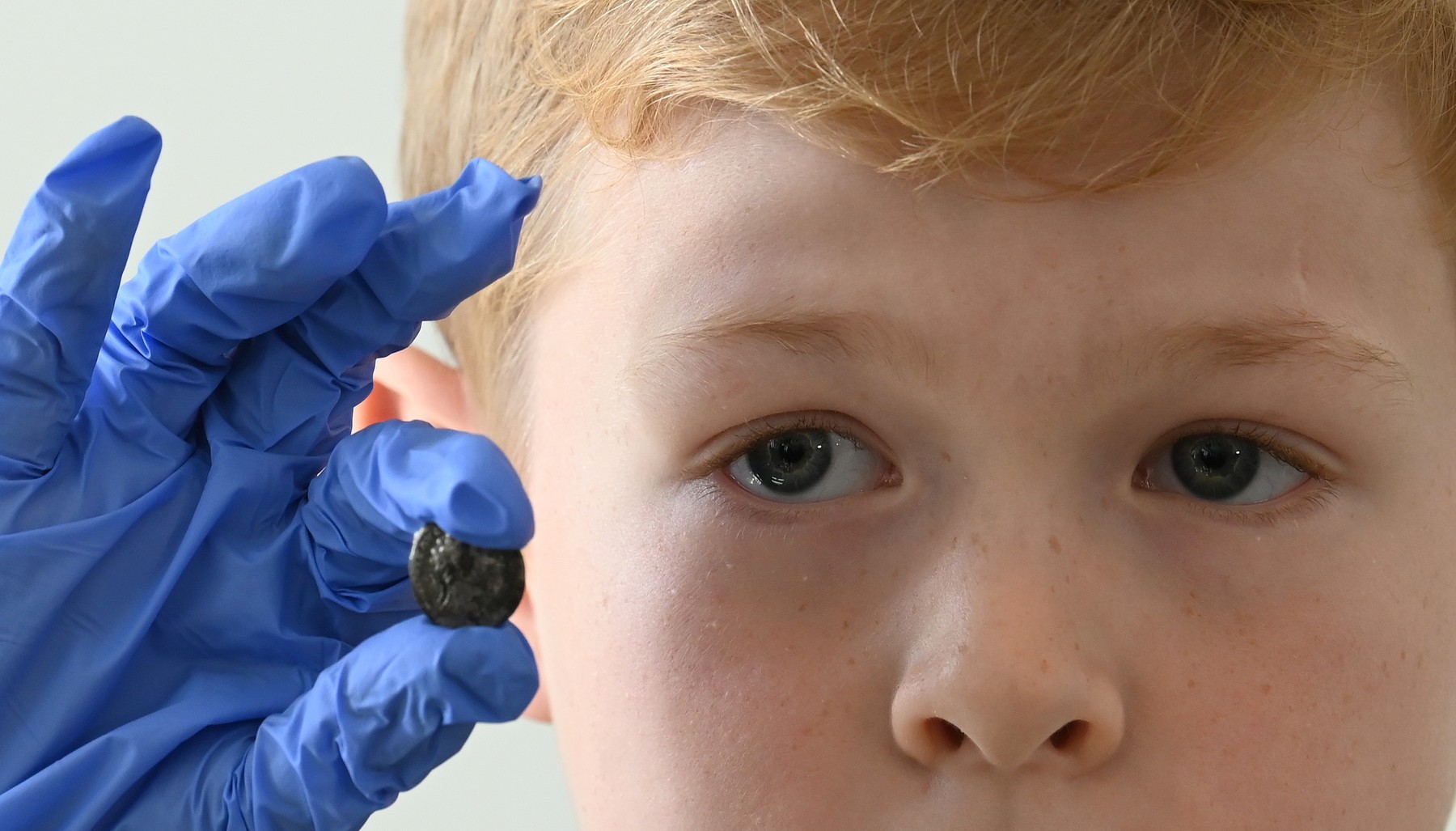 11 August 2023, Bremen: Eight-year-old Bjarne holds the 1800-year-old coin he found while playing in 2022. It is a Roman silver denarius from the 2nd century AD.,Image: 796183261, License: Rights-managed, Restrictions: , Model Release: no