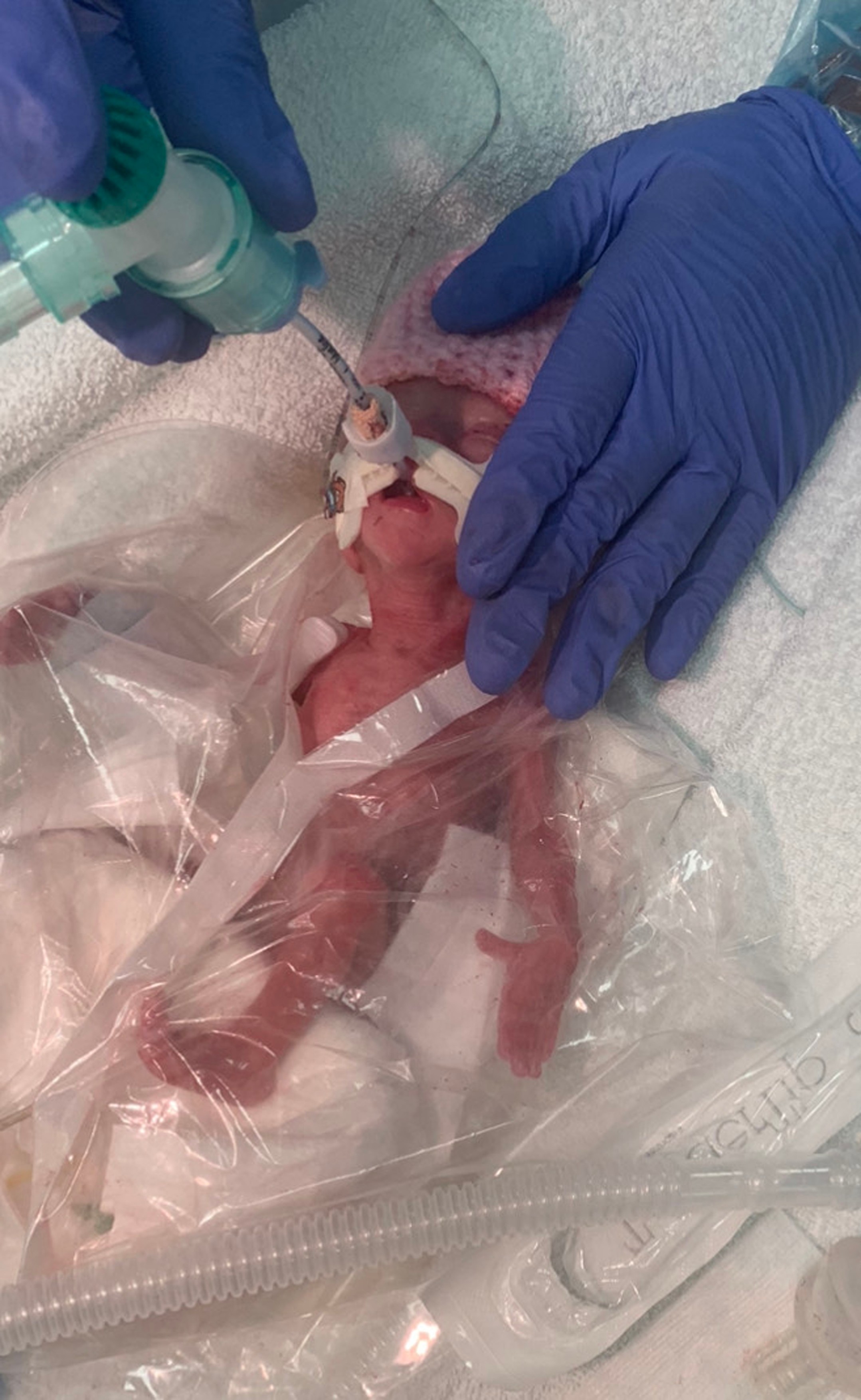 CATERS NEWS - (PICTURED Orla-May is still in an incubator) A premature baby who was smaller than her mum's hand has survived being born 13 weeks early - after quick thinking medics saved her life with a SANDWICH BAG. Teeny Orla-May Rospo-Hughes weighed just one pound when she was born last month at just 27 weeks gestation. Her parents, Emily Rospo and her partner Samantha Hughes, were warned she may not survive. But now the tiny tot is thriving - after doctors saved her life by placing her in a humble sandwich bag to help regulate her body temperature after she was born.,Image: 589817490, License: Rights-managed, Restrictions: It is not permitted to use or publish this image in a way which does not reflect a fair and true representation of the original context or in a manner which might be defamatory to any person or body or which is likely to bring the image Caters News or its licensees into disrepute., Model Release: no