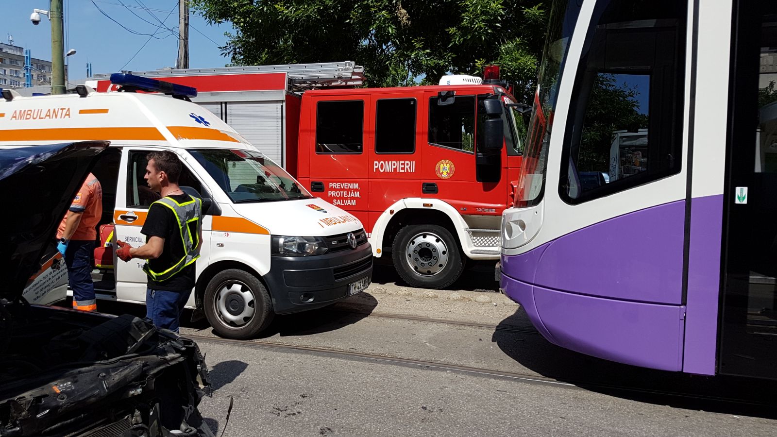 GALERIE FOTO/ Un Chevrolet Camaro a intrat într-un tramvai la Timișoara. Mașina a fost făcută praf