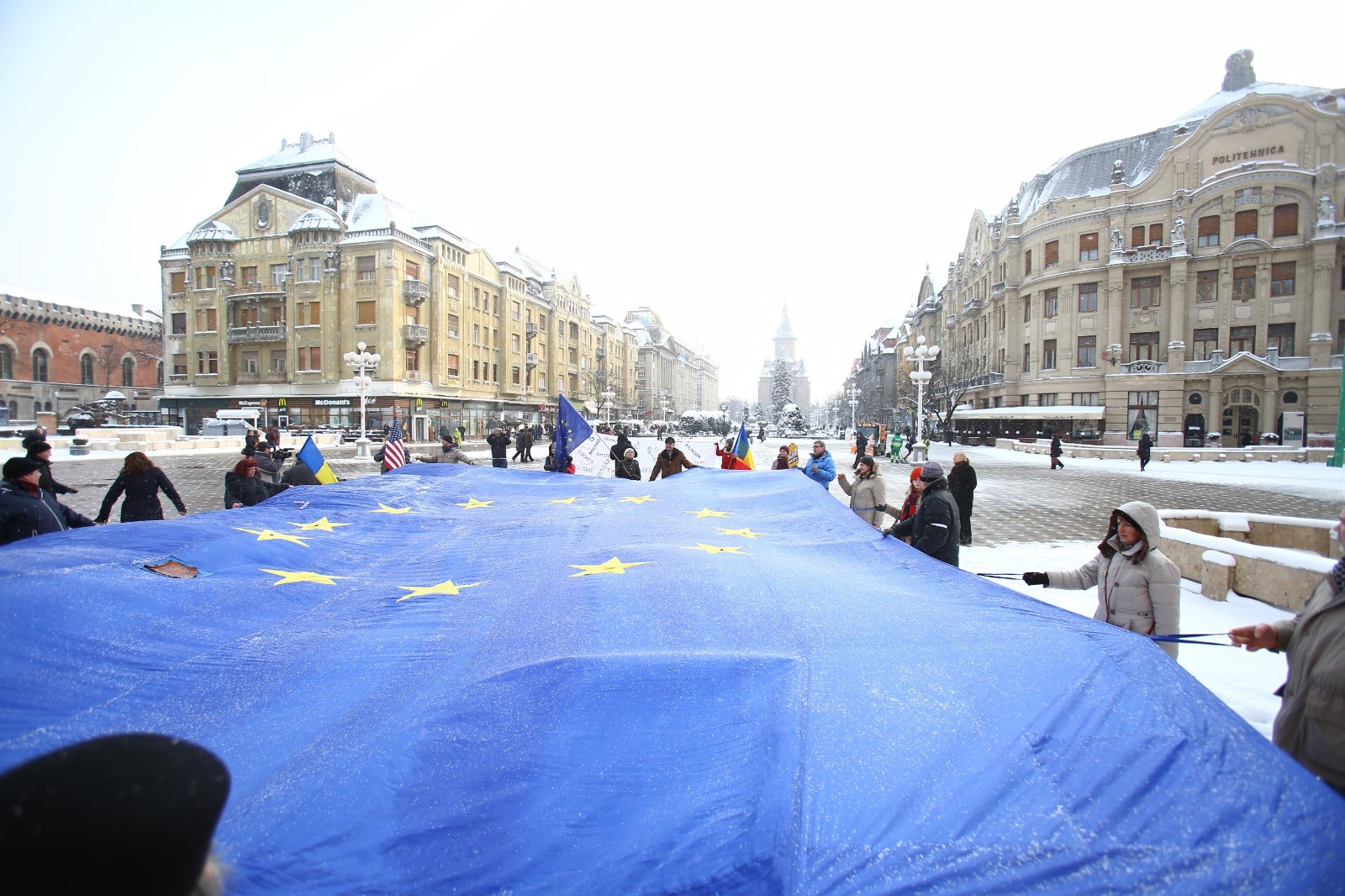 Un steag UE imens, întins în centrul Timișoarei. Adus de la Zurich, steagul va ajunge la București/FOTO