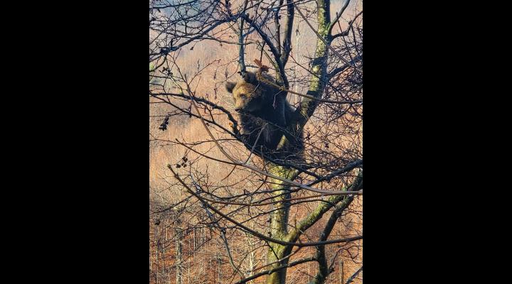 Ursul care s-a suit într-un copac din cimitirul din Azuga, lăsat să coboare după 6 ore. Autoritățile au securizat zona