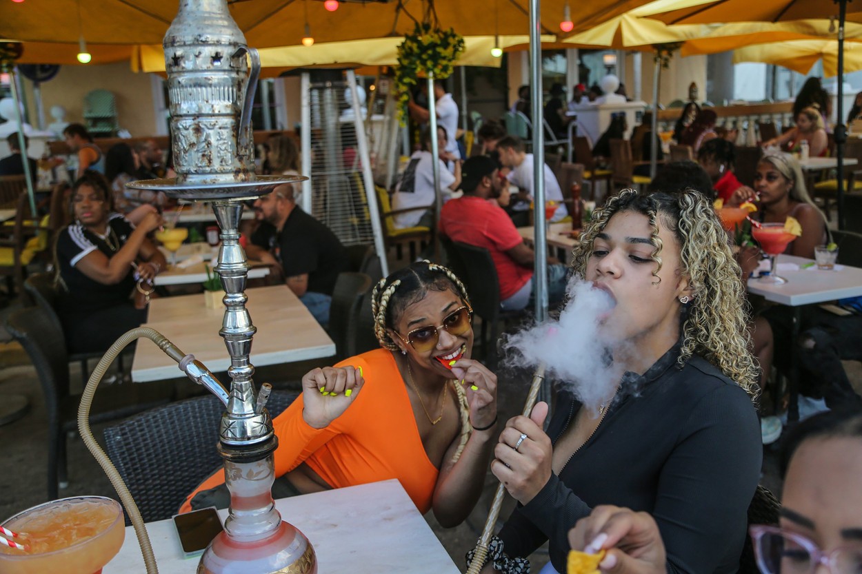 March 13, 2021, Miami, Florida, USA: Despite the coronavirus pandemic, spring breakers Karsyn Mcleod and Zayasha Fowler, both 21, spend time outdoor dining and Hookah bars along Ocean Drive on South Beach in Miami on March 12, 2021.,Image: 597144439, License: Rights-managed, Restrictions: , Model Release: no