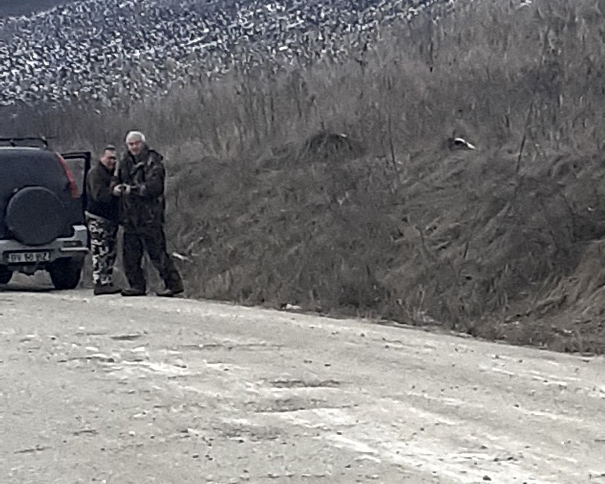 Vânător cu pușca scoasă pe geamul mașinii, la vânătoare de iepuri pe un drum public din Brașov. L-a bătut și amenințat cu moartea, spune cel care l-a filmat