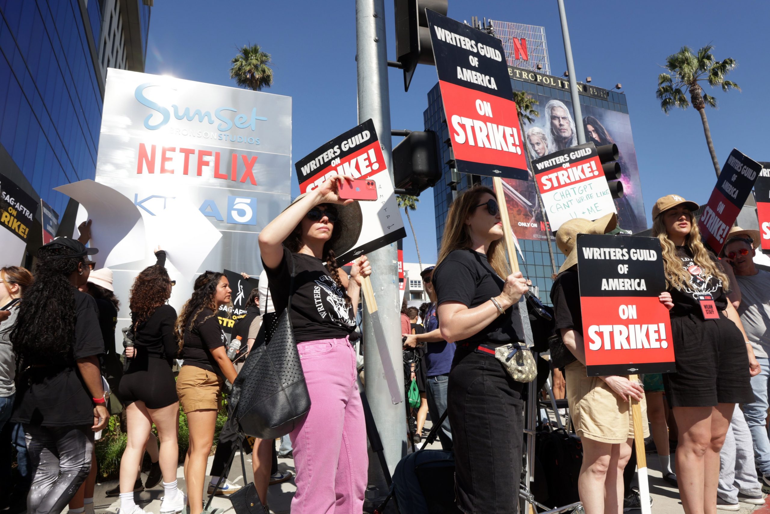 Jul 14, 2023; Los Angeles, CA, USA; Picketers stand outside of Netflix headquarters on July 14, 2023. Earlier, SAG-AFTRA authorized their members to strike after contract talks with movie and television producers broke down on July 13. The actors join members of the Writers Guild of America which has been on the picket lines for over two months.,Image: 789130760, License: Rights-managed, Restrictions: *** World Rights ***, Model Release: no
