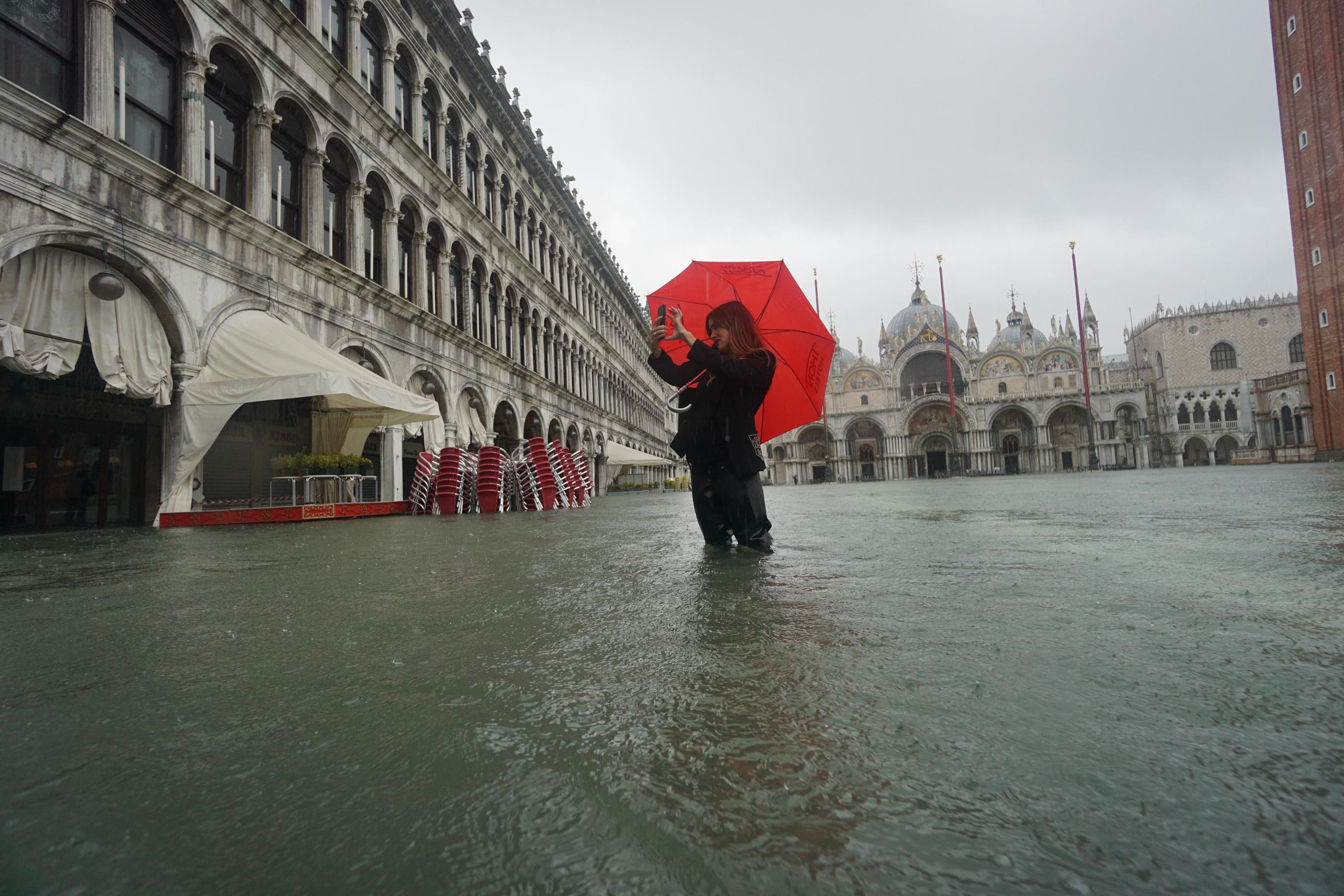 epa08021770 A woman take pictures as she wades through high water in Venice, Italy, 24 November 2019. EPA-EFE/ANDREA MEROLA
