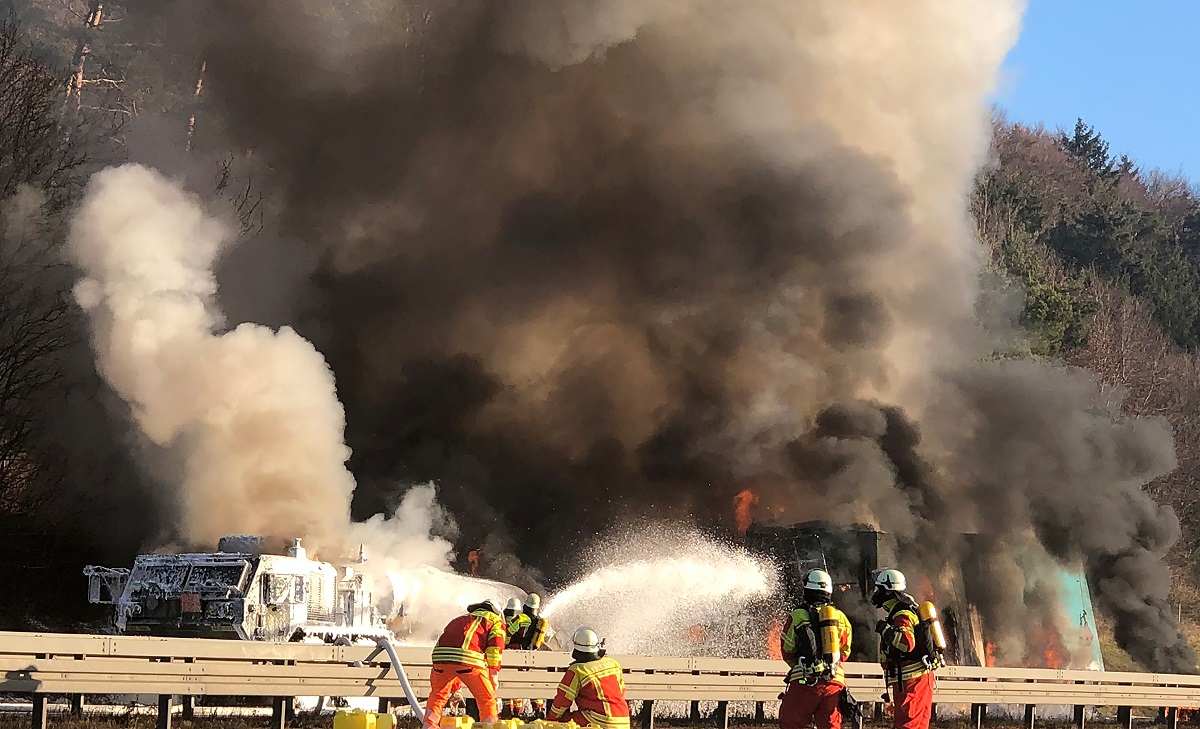epa09652067 A general view of the accident site after a truck rammed several US military vehicles on the A3 motorway near Parsberg, Germany, 20 December 2021. According to police reports, a truck rammed several vehicles of a US military convoy, two of the military vehicles were on fire, several people were injured. EPA-EFE/MARVIN KLEIN