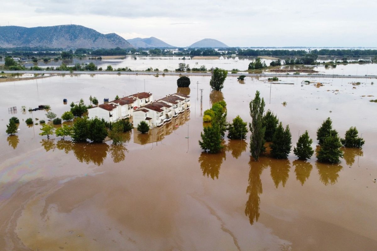 An aerial view taken on September 7, 2023 shows the flooded village of Farkadona near the city of Karditsa, central Greece. Greek rescue services were trying to reach dozens of villagers in central Greece on September 7, 2023, after deadly storms that saw more than a year's worth of rain fall there in 24 hours. Across Greece, Turkey and Bulgaria, the storms have killed at least 14 people.,Image: 803515574, License: Rights-managed, Restrictions: , Model Release: no