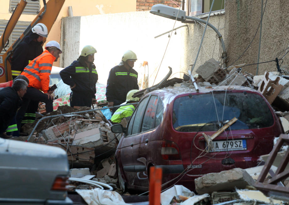 epa08027341 Rescue teams of firemen, army and police search for survivors in the rubble of a collapsed building after an earthquake in Durres, Albania, 26 November 2019. Albania was hit by a 6.4 magnitude earthquake on 26 November 2019, the strongest recorded in decades. According to reports, at least 18 people have died and several are injured in the eartquke EPA-EFE/MALTON DIBRA