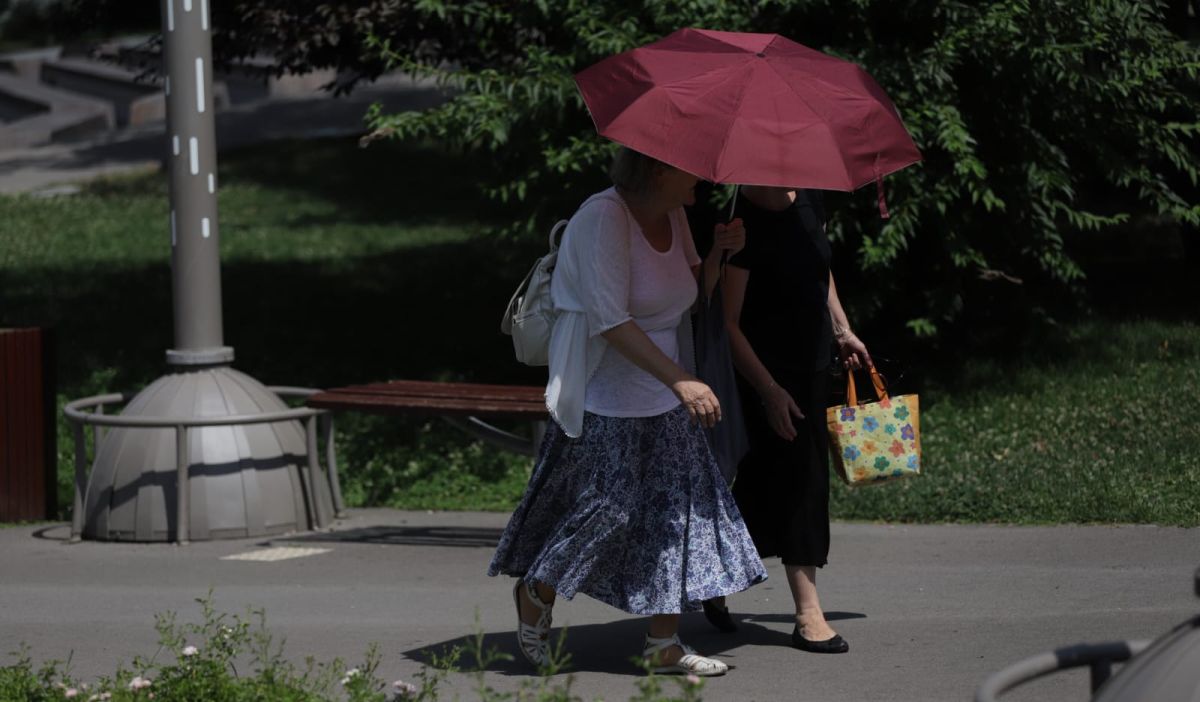 Două femei merg prin parc într-o zi caniculară de vară și se protejează de soare cu o umbrelă vișinie, București, 16 iulie 2025. Foto: Libertatea/ Dumitru Angelescu